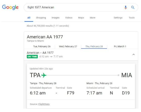 Need to pick someone up at the airport but unsure when their flight is due in? Instead of having to navigate through the menu on the carrier’s website, you can use Google to bring up the flight details for you.
