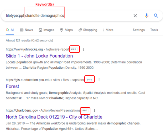 Say you need to put together a PPT about the demographics of Charlotte to attract new business to the region. Instead of doing a general search and then reformatting the data you find into a presentation, you can find other PPT presentations done on the subject for inspiration and ideas.