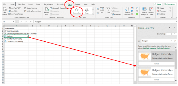 An icon should show up to the right of your text indicating the data type. If you see a question mark, the data selector window will open, and you’ll be asked to choose the specific entity that you want. For example, between two universities with similar names.